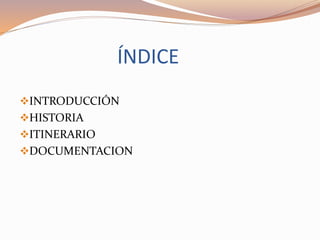 Este documento presenta un itinerario de viaje de 8 días por Puerto Rico que incluye visitas a San Juan, El Yunque, Vieques y Culebra. Comienza con una introducción sobre la oferta natural y cultural de Puerto Rico. Luego describe brevemente la historia y geografía de Puerto Rico antes de detallar el itinerario día a día que incluye visitas a sitios históricos, naturales y culturales en las diferentes localidades. Finalmente, recomienda algunas obras literarias y una película relacionadas con Puerto Rico.
