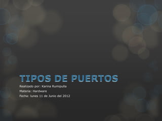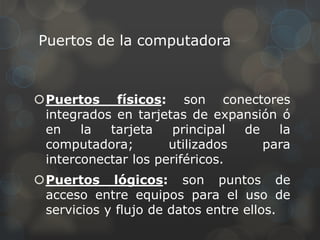 Este documento describe los diferentes puertos de una computadora, incluyendo puertos físicos, lógicos y específicos como eSATA, USB, SCSI, FireWire, paralelo, serial, miniDIN, gameport, DisplayPort, HDMI, VGA, RCA, RJ45, RJ11 y el puerto de audio de 3.5 mm. Explica sus usos, velocidades de transmisión y competidores en el mercado.