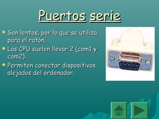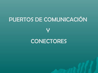 El documento describe diferentes tipos de puertos y conectores de comunicación. Los puertos serie son lentos y se usan para el ratón, mientras que los puertos PS/2 y paralelos son más rápidos. Los puertos USB son muy rápidos y permiten conectar múltiples dispositivos en cadena. Los puertos Firewire son actualmente los más rápidos, aunque solo están disponibles en placas bases modernas. Internamente, los conectores IDE se usan para discos duros y CD-ROMs, mientras que SATA ahora reemplaza a