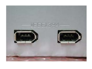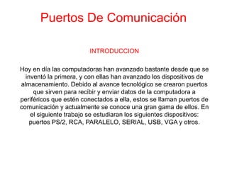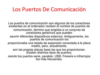 El documento habla sobre los diferentes tipos de puertos de comunicación en las computadoras. Explica que los puertos permiten que la computadora se comunique y intercambie datos con periféricos externos. Luego describe brevemente los puertos seriales, paralelos, USB, Firewire e infrarrojos, explicando sus usos y velocidades de transferencia de datos.