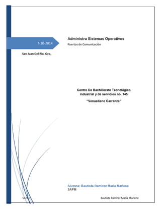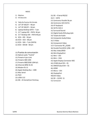 Este documento proporciona una lista y breve descripción de 50 tipos diferentes de puertos de entrada y salida comúnmente utilizados en computadoras. Incluye puertos para discos duros, comunicaciones como Ethernet, Firewire y USB, video como VGA y HDMI, y otros como puertos seriales y paralelos. El objetivo es familiarizar al lector con los diferentes tipos de puertos y sus características.