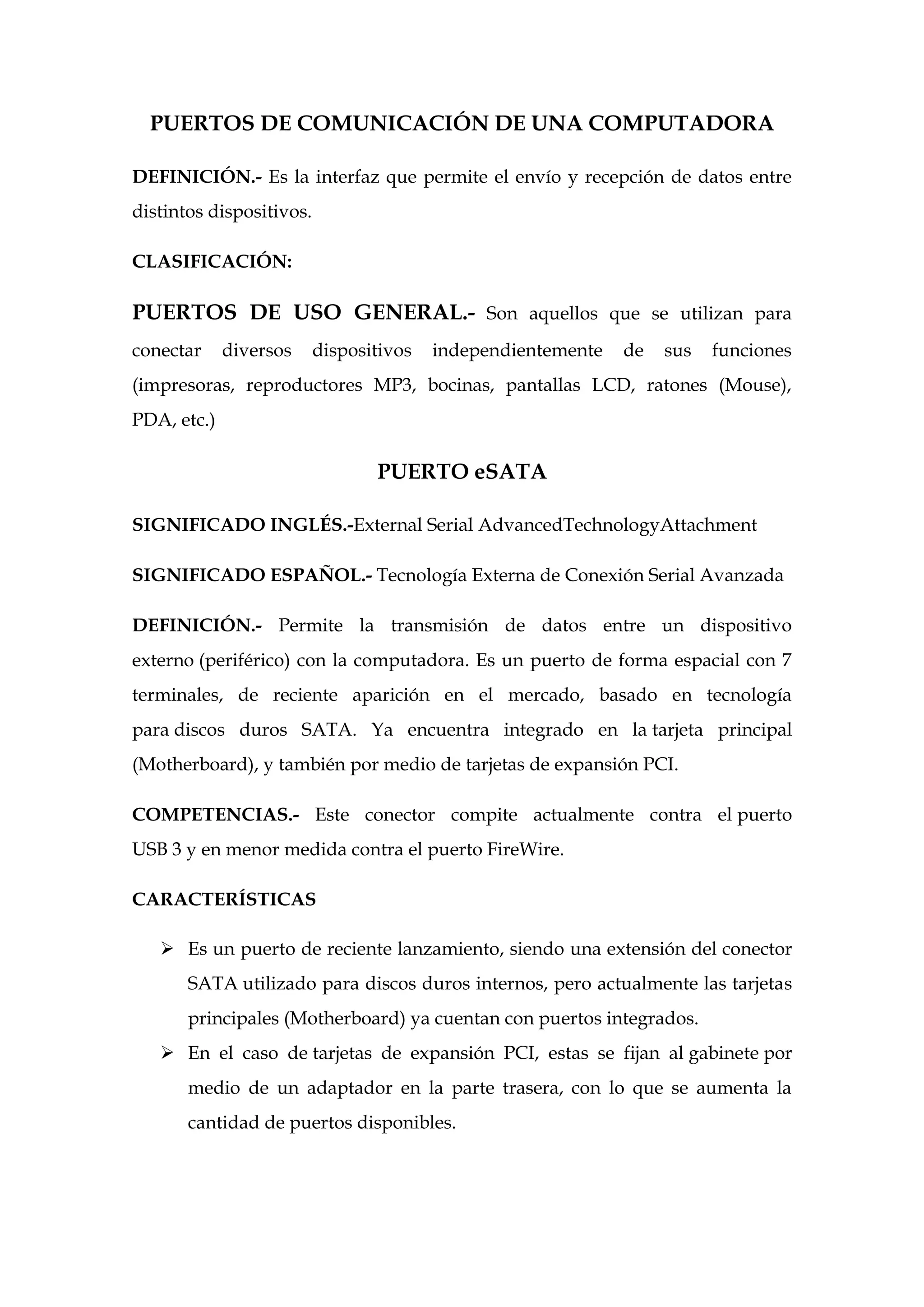 Este documento describe varios puertos de comunicación comúnmente encontrados en las computadoras, incluyendo puertos eSATA, USB, FireWire, SCSI y paralelo. Define cada puerto, enumera sus características clave como la velocidad de transmisión, y explica sus usos típicos para conectar dispositivos externos como discos duros, cámaras y impresoras.