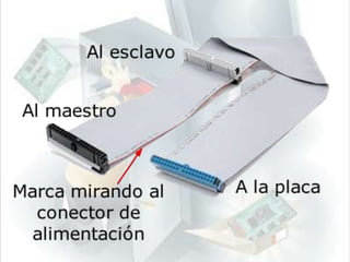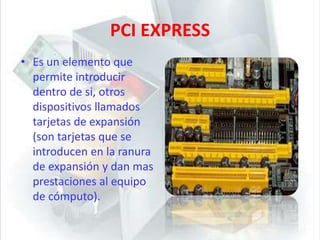 El documento describe diferentes tipos de puertos y ranuras en una placa base de computadora, incluyendo PCI Express para tarjetas de expansión, PCI y AGP para tarjetas de red, sonido y gráficas, ranuras para memoria DDR, conectores para discos duros IDE y SATA, y sockets como Socket 775 y Socket 939 para procesadores Intel y AMD. También describe ranuras AMR y CNR para tarjetas de audio, modems y red, y fuentes de alimentación AT y ATX.