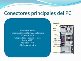 Este documento describe los principales conectores de un PC, incluyendo la fuente de poder, puertos PS/2 para teclado y mouse, puerto VGA para el monitor, puertos de audio, puertos USB para dispositivos externos, puerto de red para conectividad de red, y un puerto modem telefónico para acceso a Internet a través de una línea telefónica. Explica brevemente el propósito de cada conector.