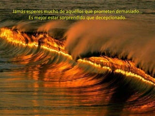 Este documento contiene una serie de reflexiones breves sobre temas como la paciencia, el perdón, la libertad, la crítica, la envidia y la educación. Algunas de las ideas principales son que es mejor sorprenderse que decepcionarse, que no importa lo lento que vayas siempre que no te detengas, y que la envidia es peor que el hambre porque es un hambre espiritual.