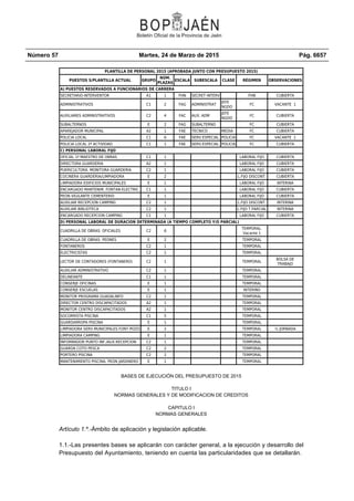 Este documento presenta la plantilla de personal aprobada junto con el presupuesto de 2015 para un ayuntamiento. Incluye una lista de puestos de trabajo divididos en categorías como funcionarios de carrera, personal laboral fijo y temporal. Detalla el número de plazas, escalafón, régimen y observaciones para cada puesto. También presenta las bases de ejecución del presupuesto de 2015, con normas generales y de modificación de créditos.