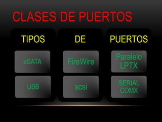 El documento describe diferentes tipos de puertos externos de una computadora, incluyendo puertos USB, FireWire, eSATA, SCSI, paralelo, y serial. Explica que estos puertos permiten la transmisión de datos entre dispositivos periféricos externos y la computadora. También brinda detalles sobre cada tipo de puerto, como su velocidad de transmisión de datos y su significado.