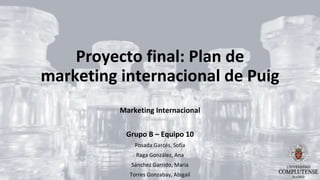 El documento presenta un plan de marketing internacional para Puig en Egipto. El plan incluye un análisis de la empresa Puig, la selección de Egipto como mercado objetivo, y estrategias para lograr los objetivos de aumentar las ventas en un 9% y la notoriedad de marca en un 30% mediante campañas publicitarias digitales y en otros medios, así como la distribución de los productos de Puig a través de socios locales. El plan también incluye calendarios de acciones, presupuestos y previsiones de ventas.
