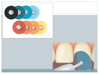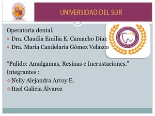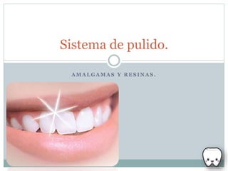 Este documento describe los procedimientos de pulido para amalgamas, resinas e incrustaciones. Explica que el pulido es el proceso final de una restauración y tiene objetivos como obtener una superficie homogénea, aumentar la resistencia del material, disminuir la retención de placa bacteriana y mejorar la estética y durabilidad de la restauración. Detalla los pasos y herramientas para el pulido de cada material, incluyendo el control y chequeo post-operatorio.