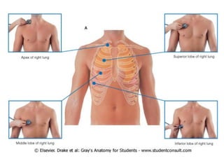 El documento describe la anatomía de los pulmones. Los pulmones están cubiertos por la pleura parietal y visceral. Cada pulmón tiene tres lóbulos y está irrigado por las arterias bronquiales y pulmonares. El hilio pulmonar contiene los bronquios, vasos sanguíneos y linfáticos. Los pulmones están divididos en segmentos broncopulmonares para facilitar la localización de lesiones.