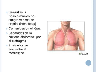 Los pulmones se encuentran en la cavidad torácica separados del abdomen por el diafragma. Cumplen la función de hematosis, transformando la sangre venosa en arterial. Están compuestos de bronquios, vasos sanguíneos y linfáticos, y lóbulos pulmonares. Los pulmones derecho e izquierdo tienen diferente número y disposición de lóbulos, pero comparten una estructura de segmentos pulmonares irrigados por pedículos vasculares y bronquiales de manera autónoma.