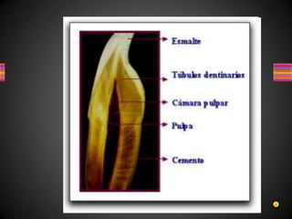 La pulpa dental se aloja en la cámara pulpar excavada en la dentina y tiene forma de la pieza dental. Está formada principalmente por agua, fibroblastos, odontoblastos y vasos sanguíneos. Los odontoblastos secretan dentina y forman la interfase pulpa-dentina. La pulpa recibe irrigación sanguínea y linfática e inervación sensitiva y autónoma a través del foramen apical.