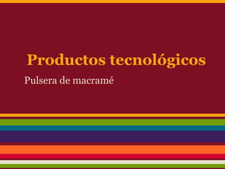 La pulsera de macramé requiere hilo encerado de diferentes colores, tijeras y cuentas. Se cortan cuatro hilos de dos metros y se unen en la parte superior. Dos hilos se pegan en el centro y los otros dos se colocan a los lados. Los hilos laterales se pasan alternadamente por encima y por debajo de los hilos centrales para formar un patrón.