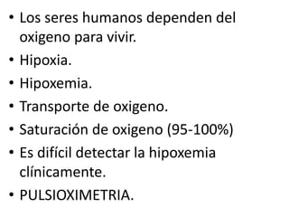 Este documento describe la pulsioximetría, una técnica no invasiva para medir la saturación de oxígeno en la sangre. Explica que mide la absorción de luz a diferentes longitudes de onda por parte de la oxihemoglobina y desoxihemoglobina en el flujo sanguíneo pulsátil. También destaca sus usos clínicos como método continuo y económico para monitorear a pacientes, aunque advierte sobre posibles errores de lectura y limitaciones de la técnica.