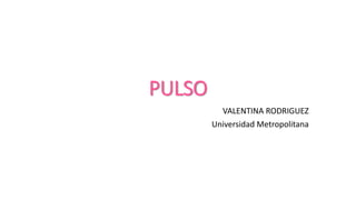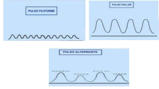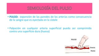 Este documento describe los conceptos fundamentales relacionados con la evaluación del pulso. Define pulso como la expansión de las arterias durante la sístole. Explica cómo palpar los diferentes pulsos y sus ubicaciones anatómicas. Además, detalla los rangos normales de frecuencia, ritmo e intensidad del pulso y algunas alteraciones comunes.