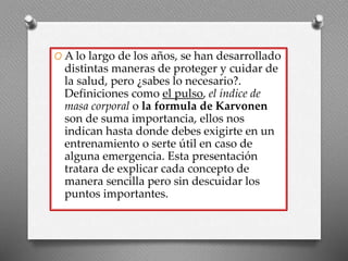 El documento explica la importancia de entender conceptos como el pulso, el índice de masa corporal (IMC) y la fórmula de Karvonen para cuidar la salud y llevar a cabo entrenamientos efectivos. Se detalla cómo medir el pulso en diferentes lugares del cuerpo y cómo calcular la frecuencia cardíaca y el IMC, además de las implicaciones de la obesidad en la salud. Se concluye enfatizando la importancia de conocer nuestro cuerpo para prevenir enfermedades sin necesidad de exámenes invasivos.