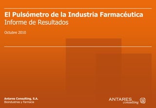 Este informe resume los resultados de la última edición del Pulsómetro de la Industria Farmacéutica realizado por Antares Consulting. El estudio evaluó las opiniones de 35 profesionales sobre temas como estrategia comercial, inteligencia competitiva, seguimiento de métricas y procesos. Los resultados mostraron acuerdo en áreas como la importancia de las nuevas tecnologías y la atención al cliente, pero también desacuerdos sobre temas como el seguimiento de métricas y la adaptación a tendencias del sector sanitario.
