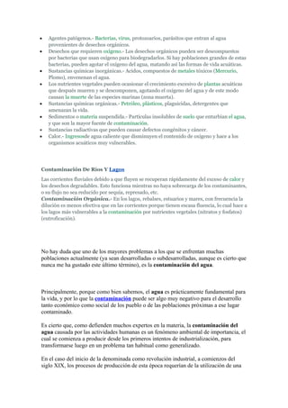 El documento describe los tipos de contaminación del agua, incluyendo agentes patógenos, desechos orgánicos, sustancias químicas inorgánicas y orgánicas, sedimentos, sustancias radiactivas y calor. Explica que la contaminación del agua se produce principalmente por las actividades humanas y puede afectar negativamente a los humanos, la fauna y otros seres vivos. También discute cómo la contaminación por nutrientes puede causar floraciones algales que consumen oxígeno y matan la vida acuática.