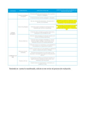 El docente solicita revisar su proceso de evaluación para el ascenso y reubicación salarial, ya que no está de acuerdo con algunas calificaciones mínimas. Pide acceder a los materiales de su evaluación como el video grabado, las respuestas a encuestas y autoevaluaciones, así como una explicación de los niveles de desempeño. También solicita revisar varios aspectos evaluados en mínimo dentro de los criterios de contexto de la práctica, reflexión y planeación, praxis pedagógica y ambiente del aula