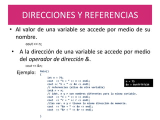Un puntero es una variable que contiene la dirección de memoria de otra variable. Para declarar un puntero se utiliza el tipo de dato al que apunta seguido de un asterisco. Los punteros se inicializan asignando la dirección de una variable existente con el operador de dirección &. El operador de indirección * se usa para acceder al valor almacenado en la dirección a la que apunta el puntero.