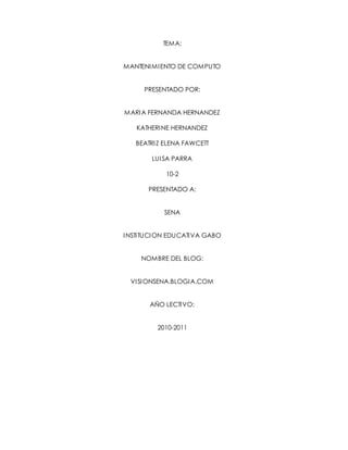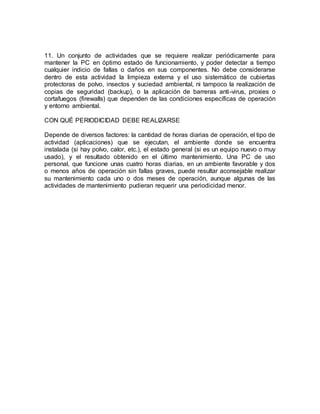 El documento habla sobre el mantenimiento de computadoras. Define el mantenimiento de computadoras como un conjunto de actividades periódicas para mantener la PC funcionando óptimamente y detectar fallas o daños en sus componentes. Explica que la periodicidad con la que se debe realizar el mantenimiento depende de factores como las horas de uso diario, el tipo de aplicaciones usadas, el ambiente donde está la PC, su edad y el resultado del último mantenimiento. Recomienda realizar el mantenimiento cada uno o dos meses para una PC de uso personal que funcione unas cu