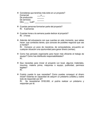 El documento describe un proyecto comercial propuesto que involucraría a 5 personas trabajando 3 horas por semana. El proponente tiene experiencia en mecánica, computadoras y ventas. Se necesitarían $100,000 para iniciar el proyecto, que el proponente podría obtener a través de un préstamo que estaría en capacidad de pagar.