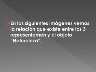 El documento describe tres representaciones de la relación entre la naturaleza y diferentes representantes: 1) una campaña contra la deforestación que muestra los árboles como pulmones del planeta; 2) el logotipo de Animal Planet, un canal conocido por documentales sobre la vida silvestre y el planeta; 3) una imagen que relaciona al hombre con la naturaleza como otro ser vivo que pertenece a ella.