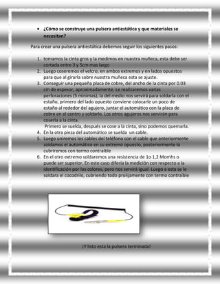 Este documento describe la electricidad estática, incluyendo qué es, sus peligros y cómo las pulseras antiestáticas pueden proteger los componentes electrónicos de daños. Explica que la electricidad estática ocurre cuando se acumula una carga eléctrica en un aislante y puede dañar chips y transistores. También detalla cómo construir una pulsera antiestática usando cinta, cobre, resistencia y cables para conectar el cuerpo a tierra y prevenir descargas.