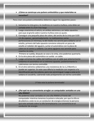 La electricidad estática se produce por la acumulación de cargas eléctricas en objetos aislantes y puede dañar componentes electrónicos. Las pulseras antiestáticas protegen estos componentes descargando de forma segura la electricidad estática del cuerpo hacia el suelo. Se construyen usando cinta aislante, una placa de cobre y un cable conectado a una resistencia, y evitan daños al equipo de computo al sentarse en sillas de plástico que no conducen la electricidad.