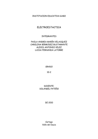 La electricidad estática se refiere a la acumulación de carga eléctrica en objetos aislantes que persiste por largos períodos. Las pulseras antiestáticas conectan el cuerpo humano a tierra para prevenir descargas eléctricas estáticas que podrían dañar componentes electrónicos sensibles. El documento explica qué son las pulseras antiestáticas, cómo se usan, cómo funcionan y cómo construir una de manera casera con materiales básicos.