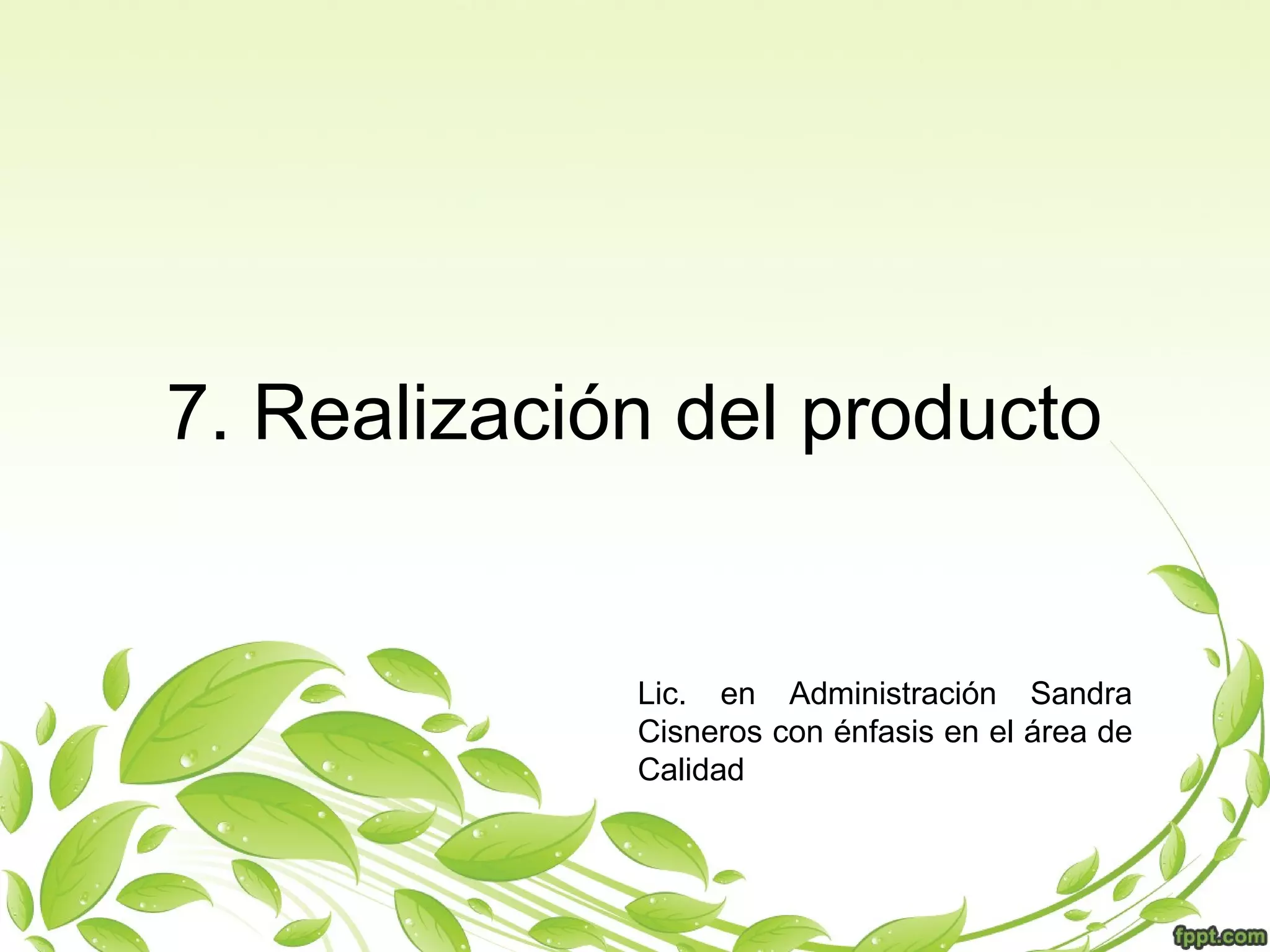 Este documento describe los procesos requeridos para la realización del producto. Estos incluyen planificar y desarrollar los procesos de producción, determinar y revisar los requisitos del cliente, diseñar y desarrollar el producto, realizar compras, controlar la producción y la prestación de servicios, e identificar y hacer un seguimiento del producto. El objetivo es asegurar que se cumplan los requisitos del cliente y los estándares de calidad en todas las etapas del proceso de producción.