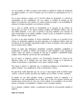 Este documento propone un punto de acuerdo para exhortar a las procuradurías de justicia estatales a abatir el rezago en la ejecución de órdenes de aprehensión. Señala que existe un gran número de órdenes sin cumplir que permiten la impunidad. Propone que las procuradurías establezcan metas para reducir el rezago, establezcan estándares de productividad para los agentes policiales, e informe periódicamente sobre los avances para prevenir futuros rezagos.