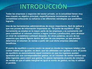 El documento explica el concepto de punto de equilibrio y cómo calcularlo para una fábrica de playeras. Originalmente, el punto de equilibrio era de 3400 playeras con ingresos y costos de $360,000. Cuando aumentaron los costos de producción, el punto de equilibrio subió a 4400 playeras y $480,000. Finalmente, al adquirir una nueva máquina, el punto de equilibrio bajó nuevamente a 4300 playeras y $435,000.