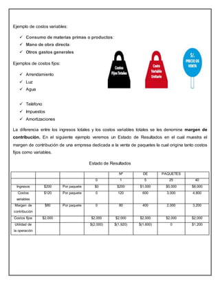Este documento discute la importancia del análisis de costos para la toma de decisiones empresariales. Explica la diferencia entre costos fijos y costos variables y cómo esta información es útil para decisiones. También presenta ejemplos de cómo calcular el punto de equilibrio y realizar presupuestos estáticos y flexibles.