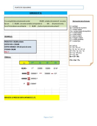Este documento presenta 5 ejercicios relacionados con el cálculo del punto de equilibrio. El primer ejercicio calcula el precio de venta unitario requerido para obtener una utilidad de $80,000. El segundo calcula el costo variable necesario para obtener una utilidad de $120,000. El tercero calcula el punto de equilibrio en ingresos. Los ejercicios 4 y 5 presentan casos más complejos para calcular puntos de equilibrio e identificar cantidades de venta requeridas.