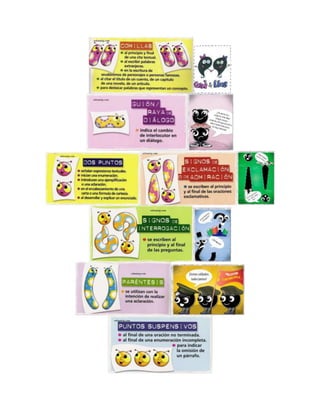 El documento aborda el uso correcto de signos de puntuación en español, incluyendo comillas, dos puntos, guiones y paréntesis. Ofrece ejemplos y ejercicios para practicar la aplicación de estas normas en diferentes contextos, como citas textuales, enumeraciones y diálogos. Además, se enfatiza la importancia de una escritura clara y precisa, proporcionando consejos para mejorar la ortografía y gramática.