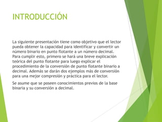 Este documento explica cómo convertir números binarios de punto flotante a números decimales. Primero introduce brevemente el concepto de punto flotante en sistemas binarios. Luego, detalla un procedimiento de 5 pasos para realizar la conversión, que incluye identificar la ubicación del punto flotante, asignar exponentes positivos y negativos, multiplicar cada dígito por su exponente, sumar los resultados y obtener el número decimal equivalente. Finalmente, ilustra el método con dos ejemplos numéricos.