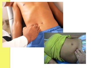 Este documento describe varios signos y síntomas clínicos asociados con la apendicitis aguda. La apendicitis ocurre con más frecuencia entre las personas de 20 a 30 años y se cree que se debe principalmente al taponamiento del apéndice por hiperplasia linfática o un apendicolito. El documento procede a describir diversos puntos dolorosos en el abdomen, así como maniobras musculares que pueden indicar apendicitis cuando causan dolor.