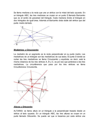 El documento describe varios puntos notables relacionados con triángulos. Explica que las mediatrices de los lados de un triángulo se cortan en un punto único llamado circuncentro, que es el centro de la circunferencia circunscrita que pasa por los tres vértices. También describe que las alturas de un triángulo se cortan en el ortocentro, y que las bisectrices de los ángulos se cortan en el incentro, que es el centro de la circunferencia inscrita. Además, explica que el bar