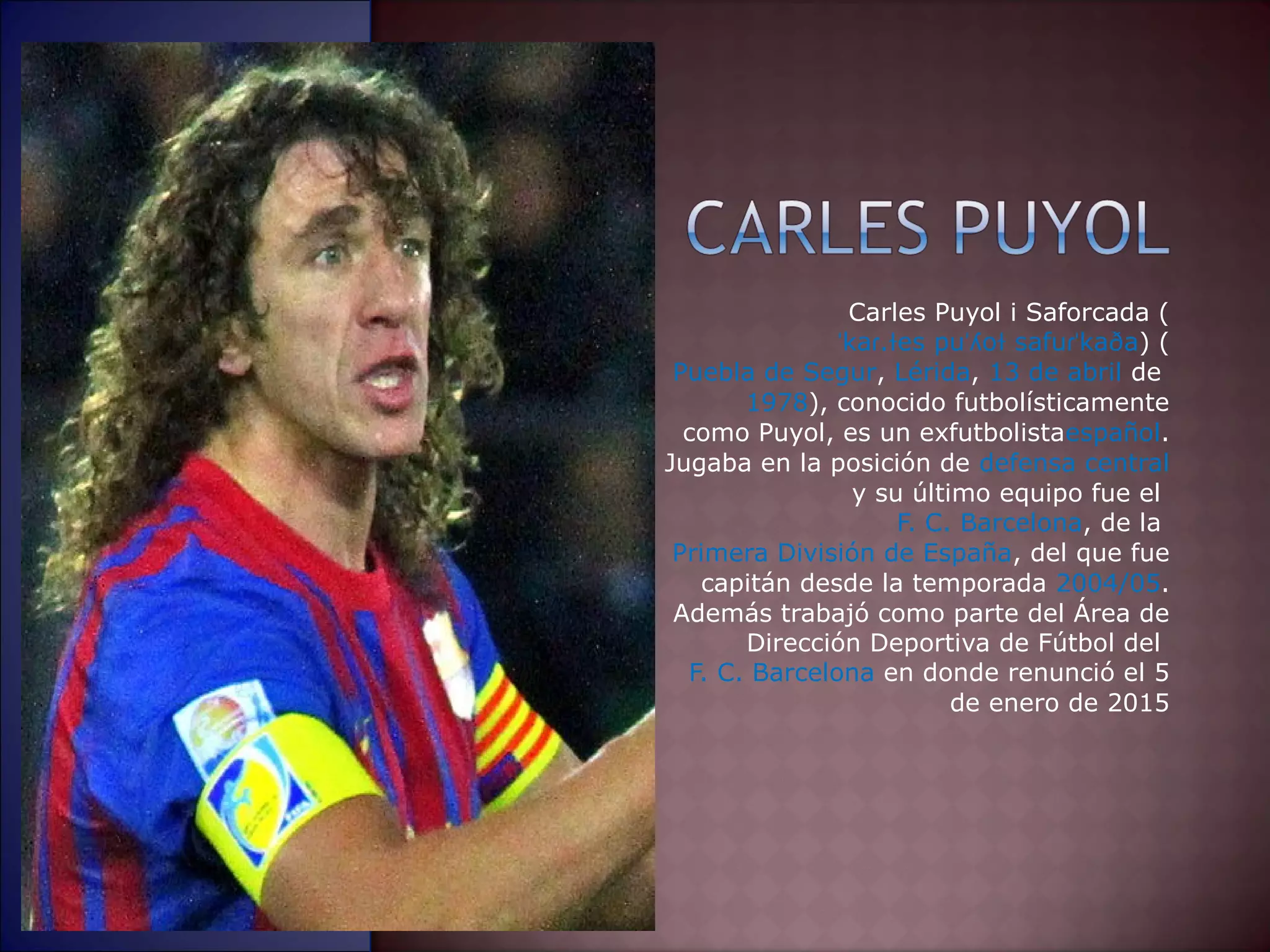 Carles Puyol fue un defensa central y capitán del F.C. Barcelona. Jugó más de 550 partidos oficiales con el Barcelona y 100 partidos con la selección española. Es conocido por su liderazgo, entrega y precisión en la marca. Se retiró en 2014 luego de una exitosa carrera en la que ganó numerosos títulos con el Barcelona y la selección española.