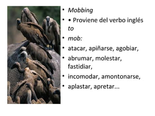 Este documento define el mobbing o acoso laboral como una forma severa de hostigamiento psicológico en el trabajo en la que una persona es sometida a ataques intencionales y repetidos por parte de uno o más compañeros de trabajo durante un largo período de tiempo con el objetivo de destruirla o forzarla a renunciar. Describe los protagonistas del mobbing, las causas, manifestaciones, consecuencias y tipos de acoso laboral como el acoso descendente, ascendente, horizontal y mixto.