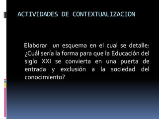 Este documento discute cómo la educación puede convertirse en una puerta de entrada o exclusión a la sociedad del conocimiento en el siglo XXI. Propone que la tecnología, la educación y el desarrollo sostenible son elementos clave y que la revolución tecnológica está transformando la educación. También presenta estrategias como aulas virtuales y redes sociales que pueden usarse para incluir a más personas en la sociedad del conocimiento.