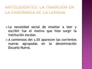 El documento trata sobre la didáctica de la lengua. Explica que su objetivo es mejorar las prácticas de enseñanza y aprendizaje de lenguas a través de la construcción de conocimientos sobre estos procesos. También describe los diferentes niveles de decisión curricular, como el currículo oficial, la programación didáctica y la programación de aula, así como las herramientas y recursos disponibles para la enseñanza y el aprendizaje de lenguas.