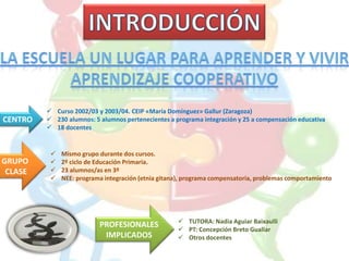 Este documento presenta la experiencia educativa de un grupo de profesores que implementaron el aprendizaje cooperativo en un aula de primaria durante dos cursos académicos. El objetivo era atender a la diversidad del alumnado de forma inclusiva. Se formaron equipos heterogéneos de estudiantes que trabajaron en proyectos comunes. Los resultados mostraron que esta metodología favoreció la interacción, participación y rendimiento de los estudiantes.