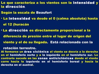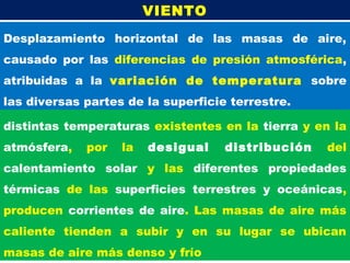 El viento se produce por las diferencias de temperatura entre la tierra y la atmósfera, lo que crea corrientes de aire. Se caracteriza por su intensidad y dirección, y puede ser constante o periódico. Existen vientos globales, estacionales y locales, incluyendo los alisios, monzones y brisas marinas/terrestres. Los vientos ciclónicos soplan hacia adentro en el centro de bajas presiones, mientras que los anticiclónicos soplan hacia afuera desde zonas de alta presión.