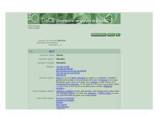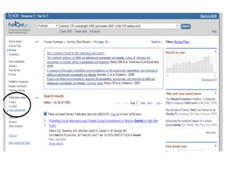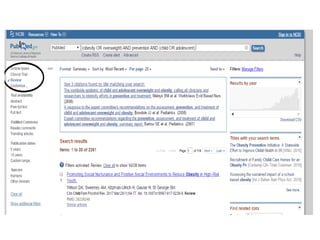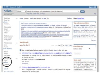 El documento trata sobre un seminario sobre estadística y TIC con el tema de la prevención de la obesidad y el sobrepeso en niños y adolescentes. Incluye palabras clave como prevención, obesidad, sobrepeso, niños y adolescentes, así como una búsqueda de artículos relevantes en la base de datos PubMed.