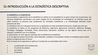 1) El documento presenta una introducción a la estadística descriptiva, describiendo sus aplicaciones en diversos campos como gobierno, ingeniería, medicina, biología, negocios, deportes y política. 2) Define conceptos básicos de estadística como estadística descriptiva y estadística inferencial. 3) Proporciona ejemplos del uso de la estadística en el desarrollo de nuevos tratamientos para el asma y el cáncer de próstata.