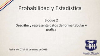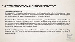 Este documento presenta información sobre tablas y gráficos estadísticos. Explica los componentes de las tablas, incluyendo el título, encabezados, cuerpo y notas al pie. También describe distribuciones de frecuencias como absolutas, relativas, acumuladas y relativas acumuladas. Finalmente, detalla diferentes tipos de gráficos como barras, circulares y de líneas, adecuados para variables cualitativas o cuantitativas.