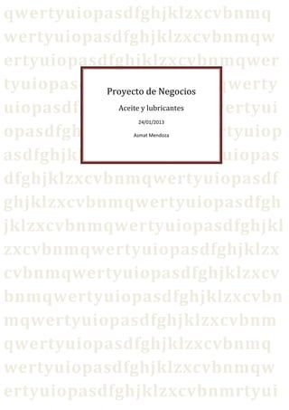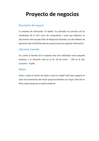 Este documento presenta un plan de negocios para una empresa de lubricantes llamada "El Rápido". La empresa ofrecerá tres paquetes de servicios de cambio de aceite para vehículos que incluyen cambios de aceite de motor, líquido de frenos y aceite de transmisión. La empresa tiene como misión proveer servicios de cambio de aceite para asegurar el buen funcionamiento de los motores y extender su vida útil de manera ambientalmente responsable. La empresa se ubicará en Trujillo y busca incrementar su número de clientes en un 15