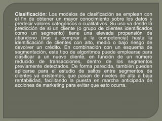 La clasificación se usa para predecir valores categóricos o cualitativos como la probabilidad de abandono de un cliente o el riesgo de incumplimiento de un crédito. La predicción estima valores numéricos o cuantitativos como el gasto futuro de un cliente o su propensión a responder a una campaña. Ambos, clasificación y predicción, permiten construir modelos a partir de los hábitos de compra de los clientes para comprender mejor los datos y predecir resultados.